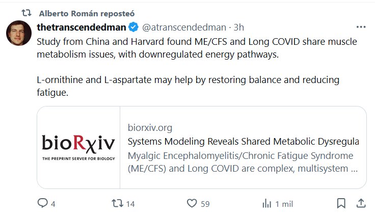 EN INGLÉS El estudio de China y Harvard encontró ME/CFS y Long Covid comparten problemas de metabolismo muscular, con vías de energía reguladas por negación. L-Nornitina y L-Aspartato pueden ayudar restaurando el equilibrio y reduciendo la fatiga