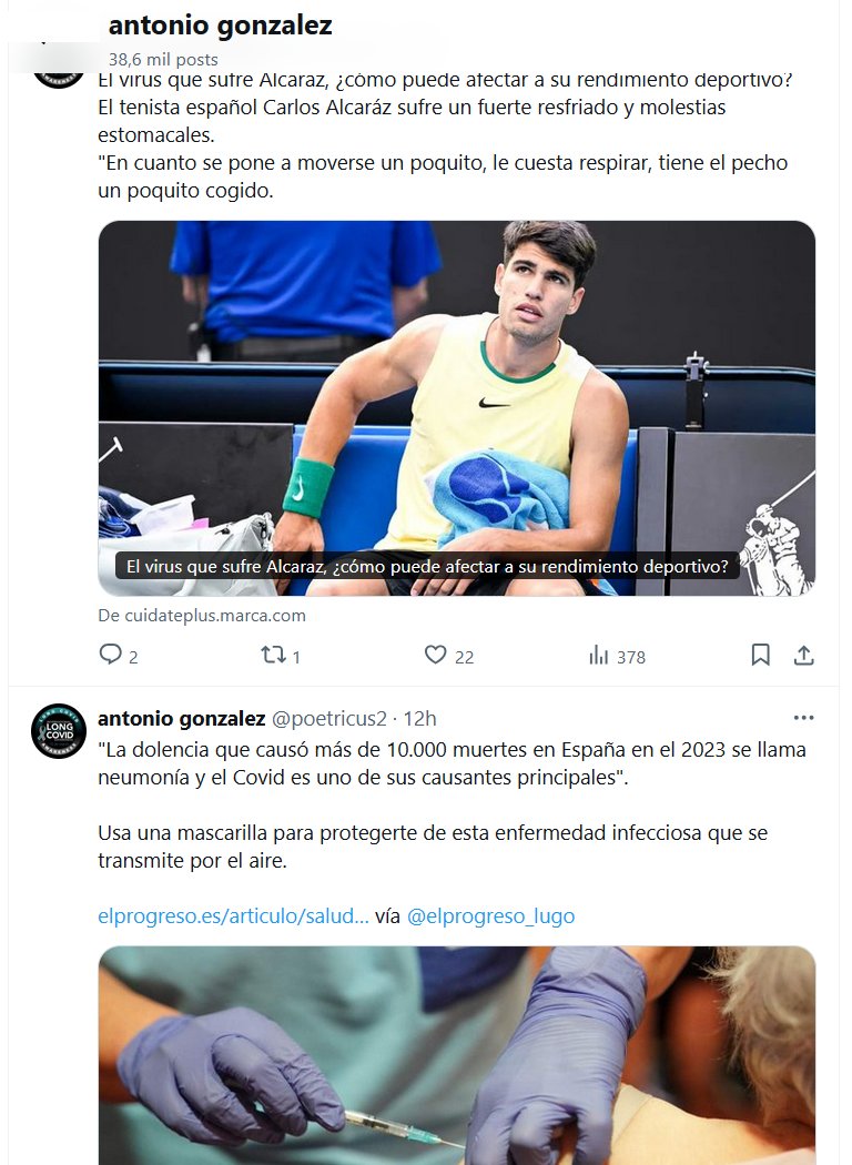 NOTICIAS DE ESPAÑA «La dolencia que causó más de 10.000 muertes en España en el 2023 se llama neumonía y el Covid es uno de sus causantes principales». Usa una mascarilla para protegerte de esta enfermedad infecciosa que se transmite por el aire El virus que sufre Alcaraz, ¿cómo puede afectar a su rendimiento deportivo? El tenista español Carlos Alcaráz sufre un fuerte resfriado y molestias estomacales. «En cuanto se pone a moverse un poquito, le cuesta respirar, tiene el pecho un poquito cogido