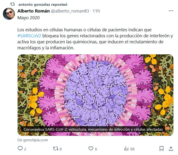 QUE COVID ERA MÁS COMO SIDA QUE COMO GRIPE SE SUPO DESDE EL PRINCIPIO Mayo 2020 Los estudios en células humanas o células de pacientes indican que #SARSCoV2 bloquea los genes relacionados con la producción de interferón y activa los que producen las quimiocinas, que inducen el reclutamiento de macrófagos y la inflamación.