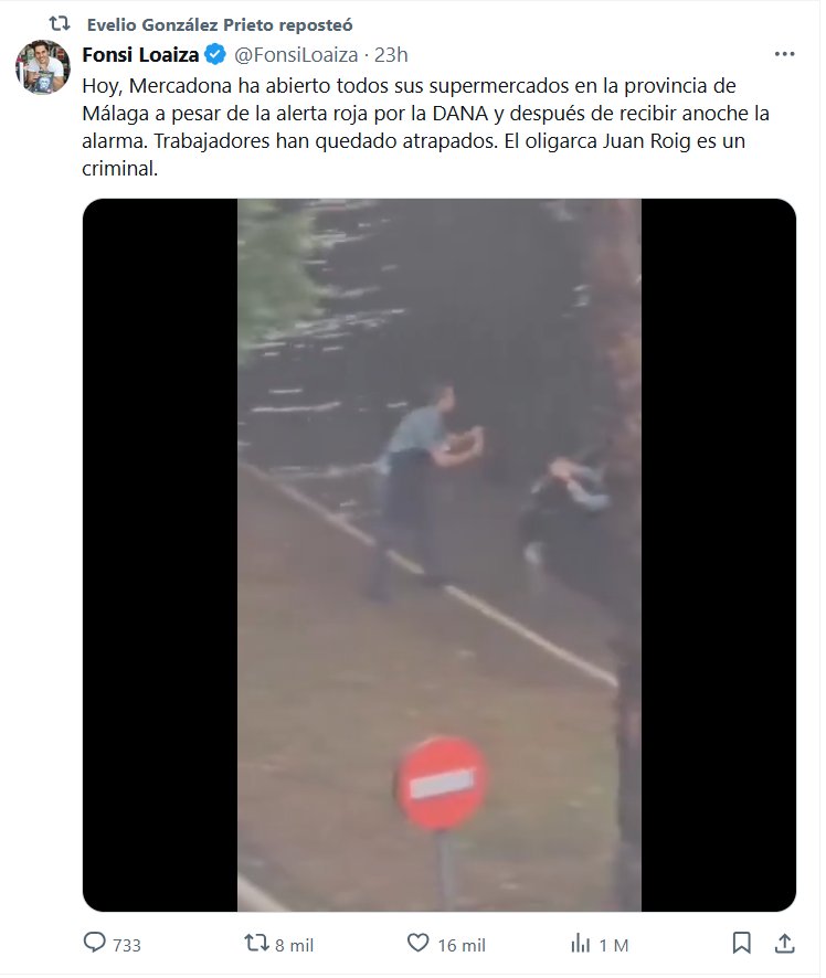 EL CORONAVIRUS NO ES EL ÚNICO ASESINO Evelio González Prieto reposteó Fonsi Loaiza @FonsiLoaiza · Hoy, Mercadona ha abierto todos sus supermercados en la provincia de Málaga a pesar de la alerta roja por la DANA y después de recibir anoche la alarma. Trabajadores han quedado atrapados. El oligarca Juan Roig es un criminal.
