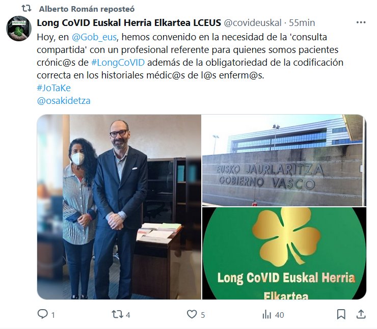 Long CoVID Euskal Herria Elkartea LCEUS @covideuskal · 54min Hoy, en @Gob_eus , hemos convenido en la necesidad de la ‘consulta compartida’ con un profesional referente para quienes somos pacientes crónic@s de #LongCoVID además de la obligatoriedad de la codificación correcta en los historiales médic@s de l@s enferm@s