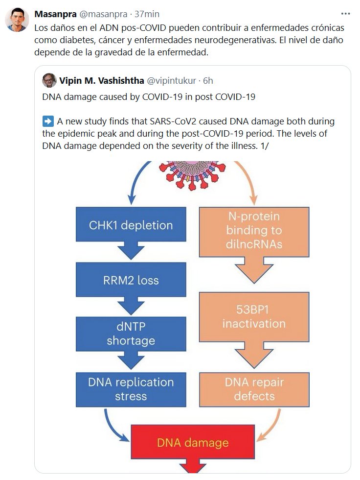 Los daños en el ADN pos-COVID pueden contribuir a enfermedades crónicas como diabetes, cáncer y enfermedades neurodegenerativas. El nivel de daño depende de la gravedad de la enfermedad Posted on noviembre 14, 2024 por coronado https://x.com/masanpra/status/1857052866638184746