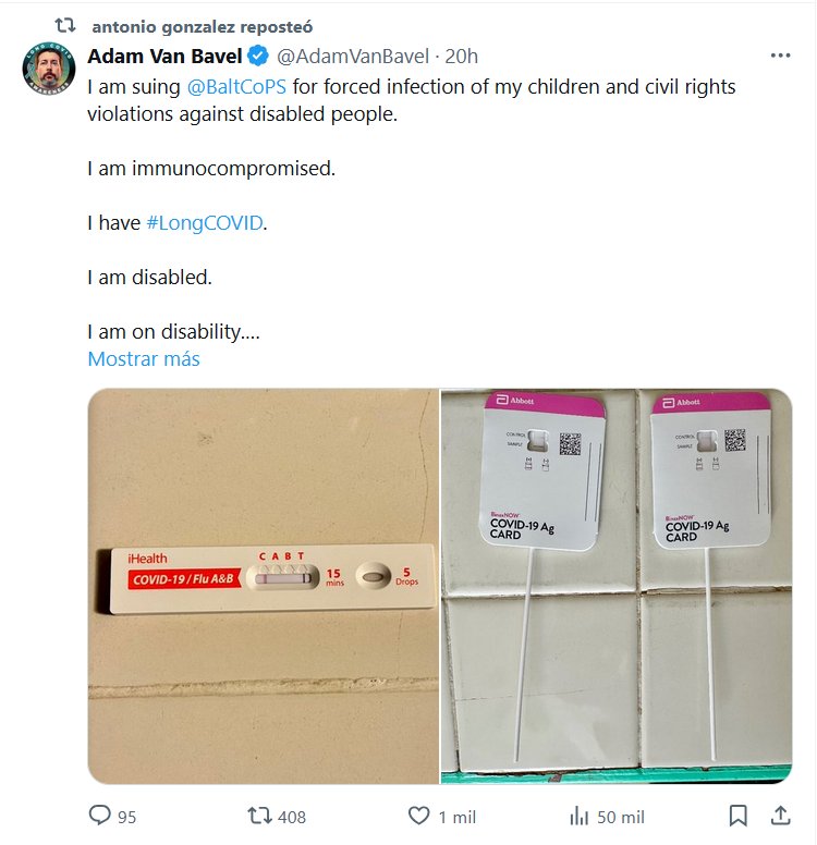 TESTIMONIOS (EN INGLÉS) Adam Van Bavel @AdamVanBavel Estoy demandando a @BaltCoPS por la infección forzada de mis hijos y por violaciones de los derechos civiles contra personas discapacitadas. Tengo un sistema inmunológico comprometido. Tengo COVID-19 prolongado. Soy discapacitado. Estoy discapacitado.