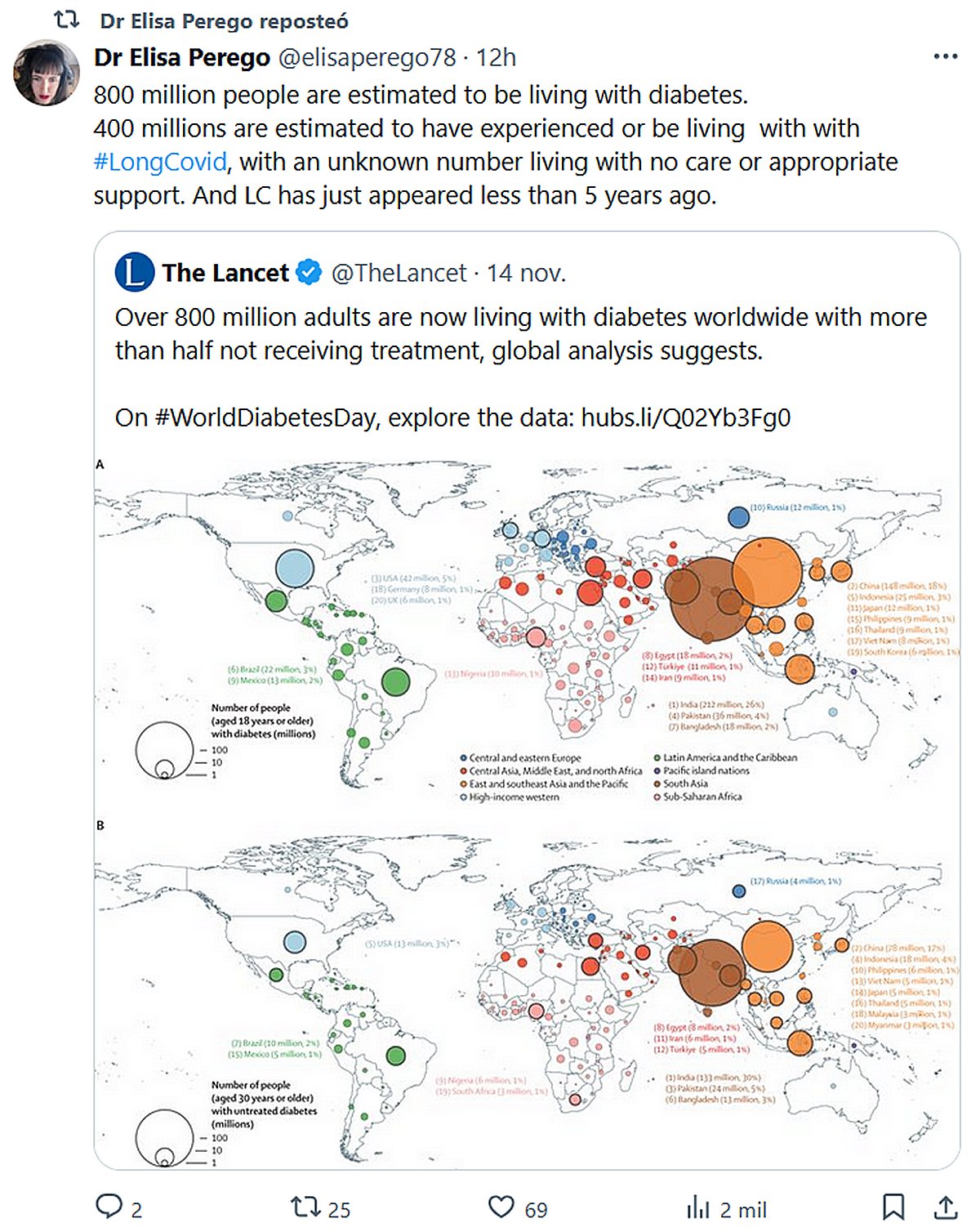 THE LANCET (EN INGLÉS) Dra. Elisa Perego @elisaperego78 Se estima que 800 millones de personas viven con diabetes. Se estima que 400 millones han experimentado o viven con #CovidProlongado, y un número desconocido vive sin atención ni apoyo adecuado. Y la LC apareció hace menos de 5 años