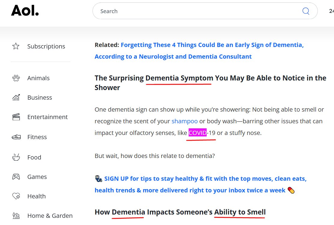DEMENCIA Y COVID-19 COMPARTEN SÍNTOMA (EN INGLÉS) Un signo de demencia puede aparecer mientras te duchas: no poder oler o reconocer el aroma de tu champú o gel de baño, salvo otros problemas que pueden afectar tu sentido del olfato, como el COVID-19 o la congestión nasal