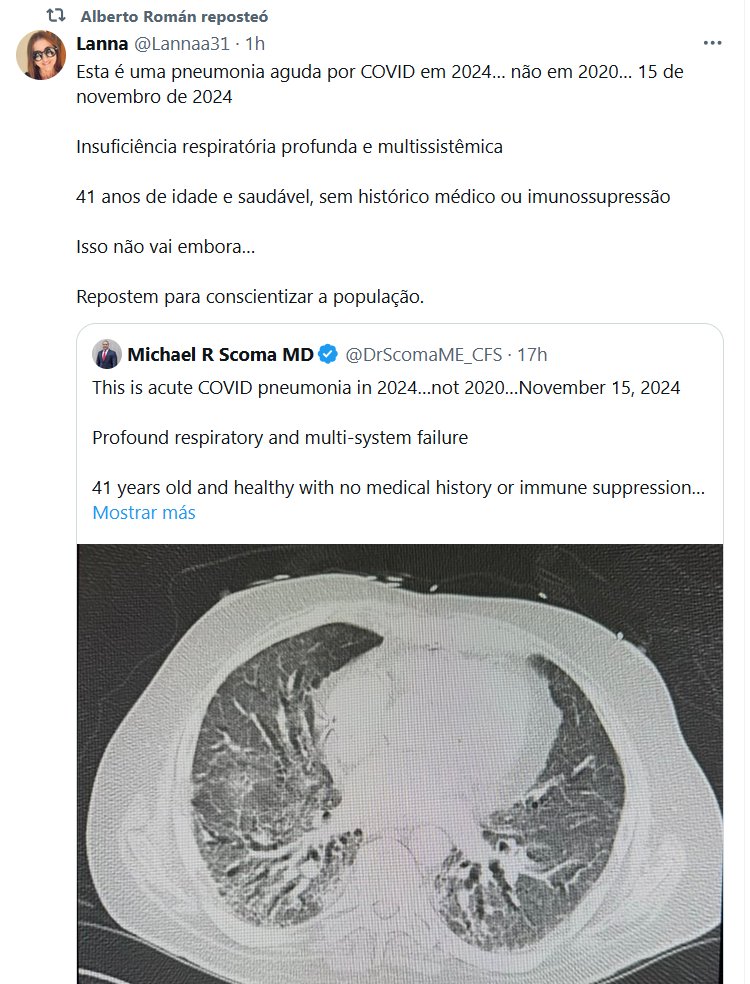 EN PORTUGUÉS Esta es la neumonía aguda por COVID en 2024… no en 2020… 15 de noviembre de 2024 Insuficiencia respiratoria profunda y multisistémica 41 años y sano, sin antecedentes médicos ni inmunosupresión No va a desaparecer… REPOSTEEN PARA CONCIENTIZAR A LA POBLACIÓN