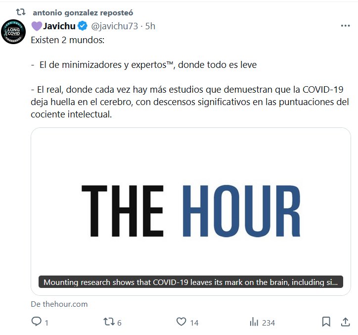 💜Javichu @javichu73 · Existen 2 mundos: – El de minimizadores y expertos™, donde todo es leve – El real, donde cada vez hay más estudios que demuestran que la COVID-19 deja huella en el cerebro, con descensos significativos en las puntuaciones del cociente intelectual.