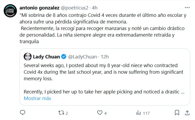 TESTIMONIOS «Mi sobrina de 8 años contrajo Covid 4 veces durante el último año escolar y ahora sufre una pérdida significativa de memoria. Recientemente, la recogí para recoger manzanas y noté un cambio drástico de personalidad. La niña siempre alegre era extremadamente retraída y tranquila»