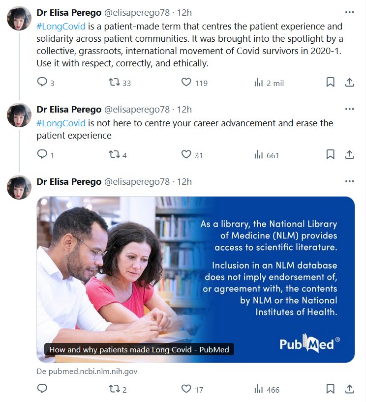 EN INGLÉS Dra. Elisa Perego @elisaperego78 #LongCovid es un término creado por pacientes que se centra en la experiencia del paciente y la solidaridad entre las comunidades de pacientes. Fue puesto de relieve por un movimiento colectivo, de base e internacional de supervivientes de la COVID en 2020-2021. Úselo con respeto, de forma correcta y ética.