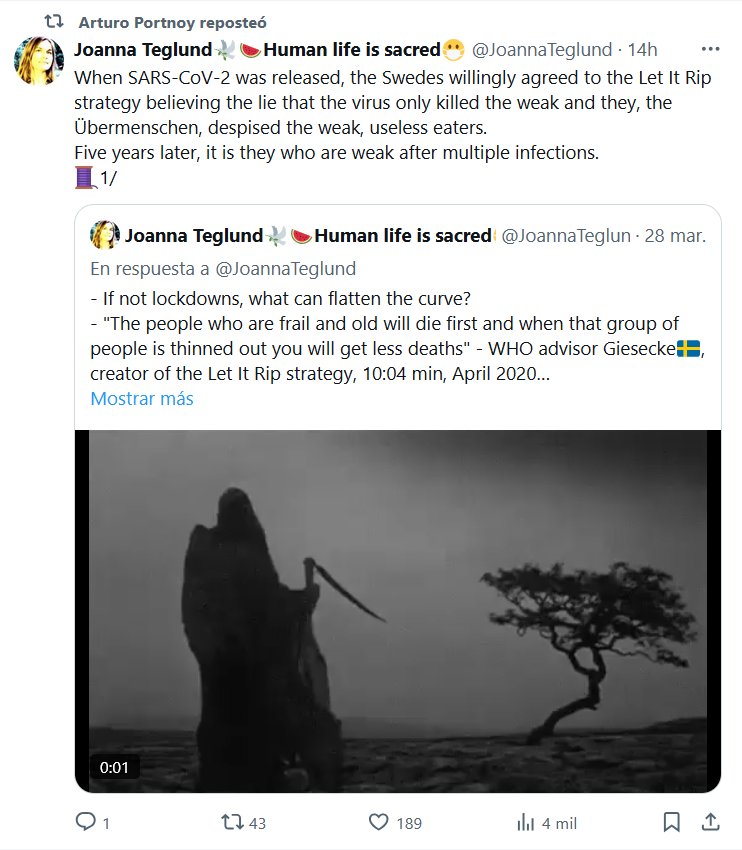 NO HAGAS A OTRO LO QUE NO QUIERES PARA TI (EN INGLÉS) Cuando se liberó el SARS-CoV-2, los suecos aceptaron voluntariamente la estrategia de Let It Rip creyendo la mentira de que el virus solo mataba a los débiles y que ellos, los Übermenschen, despreciaban a los débiles e inútiles comedores. Cinco años después, son ellos los que están débiles después de múltiples infecciones