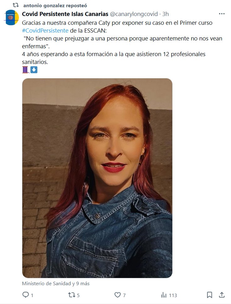Covid Persistente Islas Canarias @canarylongcovid · 3h Gracias a nuestra compañera Caty por exponer su caso en el Primer curso #CovidPersistente de la ESSCAN: «No tienen que prejuzgar a una persona porque aparentemente no nos vean enfermas». 4 años esperando a esta formación a la que asistieron 12 profesionales sanitarios