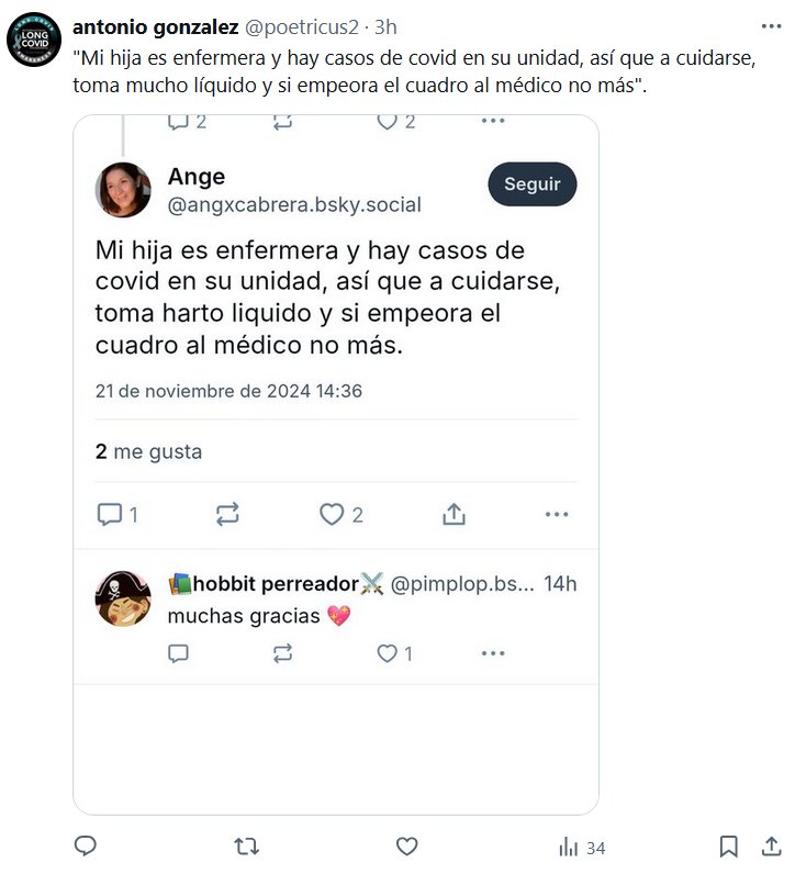 TESTIMONIOS «Mi hija es enfermera y hay casos de covid en su unidad, así que a cuidarse, toma mucho líquido y si empeora el cuadro al médico no más». Posted on noviembre 22, 2024 por coronado