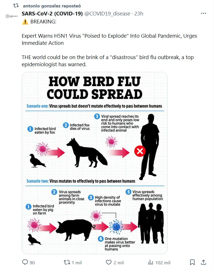 PARAPANDEMIA-SS (EN INGLÉS) SARS-CoV-2 (COVID-19) @COVID19_disease ⚠️ ÚLTIMA HORA: Un experto advierte que el virus H5N1 está «a punto de estallar» y convertirse en una pandemia mundial, y pide que se tomen medidas de inmediato El mundo podría estar al borde de un brote de gripe aviar «desastroso», advirtió un destacado epidemiólogo.