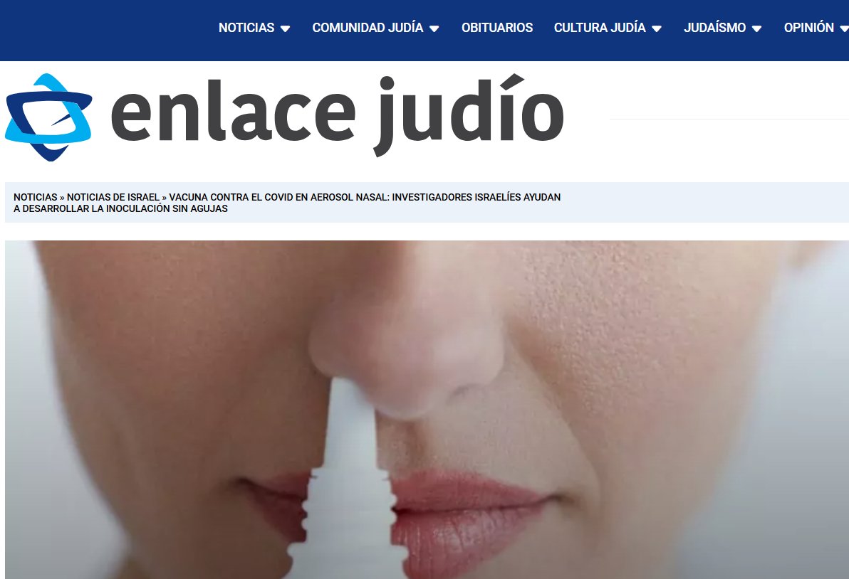 Vacuna contra el COVID en aerosol nasal: investigadores israelíes ayudan a desarrollar la inoculación sin agujas Posted on noviembre 22, 2024 por coronado https://www.enlacejudio.com/2024/11/22/vacuna-contra-el-covid-en-aerosol-nasal-investigadores-israelies-ayudan-a-desarrollar-la-inoculacion-sin-agujas-2/