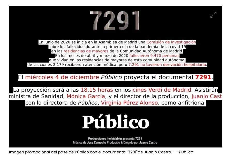 ‘Público’ proyecta el documental ‘7291’ sobre las muertes de mayores por covid-19 en las residencias de Madrid Posted on noviembre 23, 2024 por coronado https://www.publico.es/sociedad/publico-proyecta-documental-7291-muertes-mayores-covid-19-residencias-madrid.html