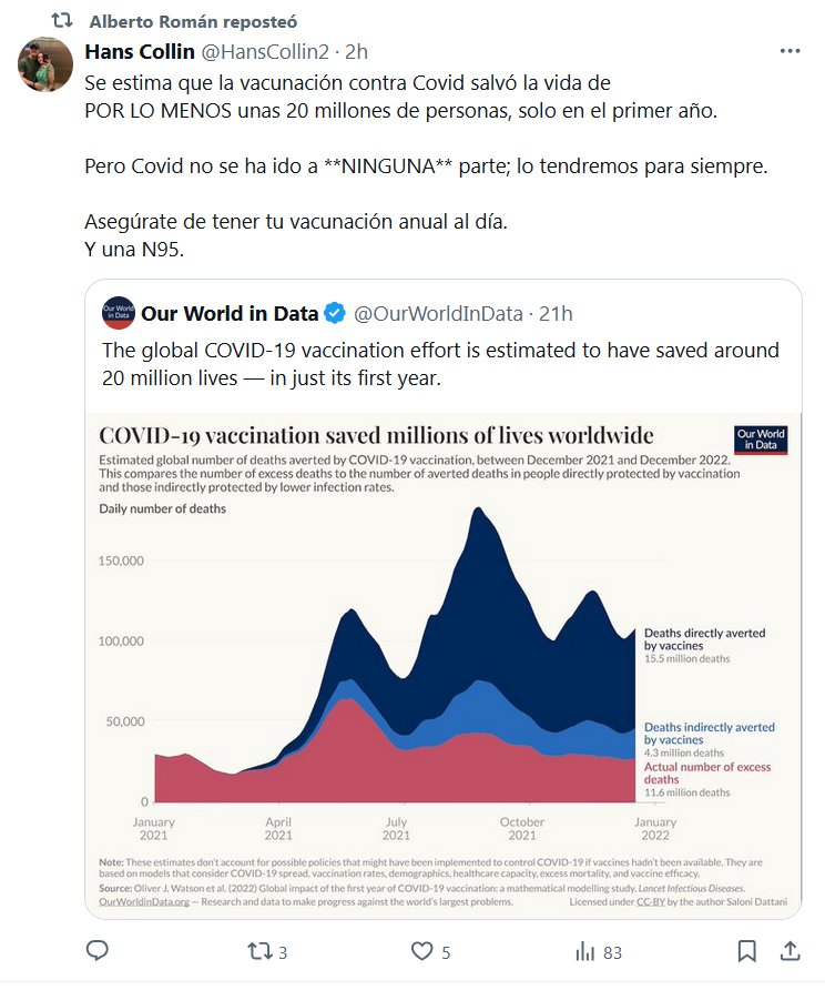 Se estima que la vacunación contra Covid salvó la vida de POR LO MENOS unas 20 millones de personas, solo en el primer año. Pero Covid no se ha ido a **NINGUNA** parte; lo tendremos para siempre. Asegúrate de tener tu vacunación anual al día. Y una N95.