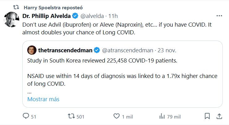 EN INGLÉS Harry Spoelstra repostó Dr. Phillip Alvelda @alvelda No use Advil (ibuprofeno) o Aleve (naproxeno), etc. si tiene COVID. Casi duplica la probabilidad de tener COVID persistente. Posted on noviembre 24, 2024 por coronado https://x.com/atranscendedman/status/1860318218818134227 https://journals.plos.org/plosone/article?id=10.1371/journal.pone.0312530