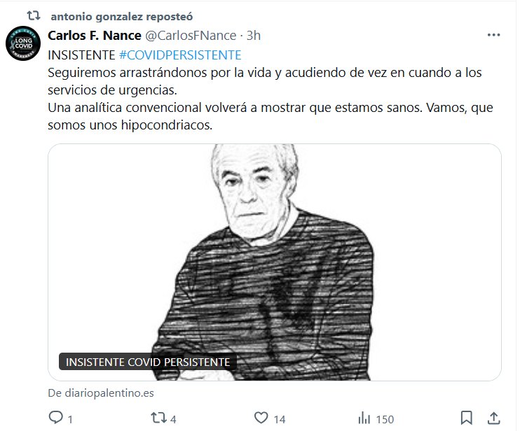 ESCUCHO VOCES INSISTENTE #COVIDPERSISTENTE Seguiremos arrastrándonos por la vida y acudiendo de vez en cuando a los servicios de urgencias. Una analítica convencional volverá a mostrar que estamos sanos. Vamos, que somos unos hipocondriacos.
