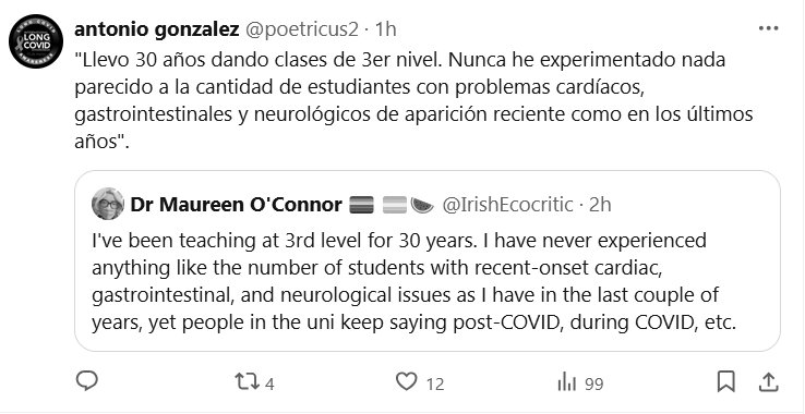 POSTCOVID HACE ESTRAGOS: TESTIMONIOS «Llevo 30 años dando clases de 3er nivel. Nunca he experimentado nada parecido a la cantidad de estudiantes con problemas cardíacos, gastrointestinales y neurológicos de aparición reciente como en los últimos años»