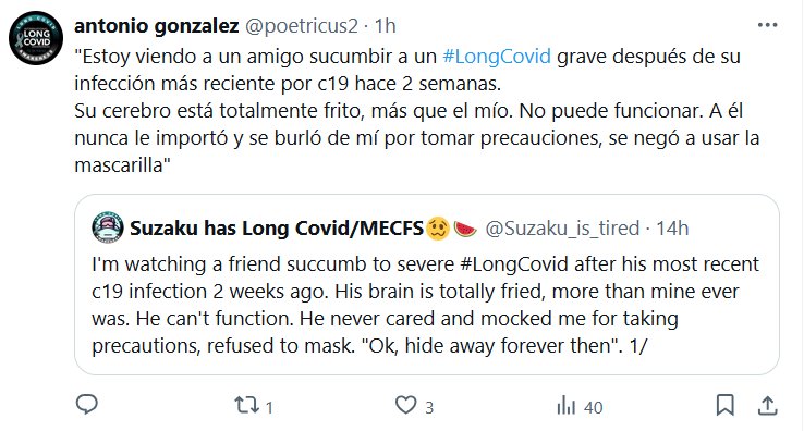 TESTIMONIOS «Estoy viendo a un amigo sucumbir a un #LongCovid grave después de su infección más reciente por c19 hace 2 semanas. Su cerebro está totalmente frito, más que el mío. No puede funcionar. A él nunca le importó y se burló de mí por tomar precauciones, se negó a usar la mascarilla»