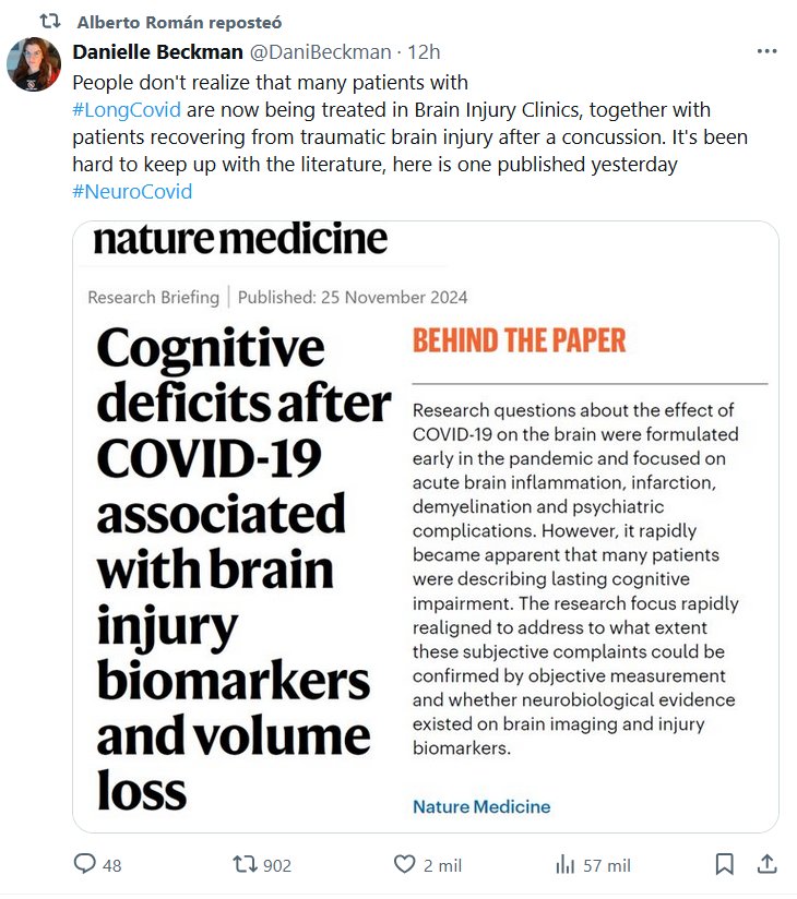 EN INGLÉS La gente no se da cuenta de que muchos pacientes con #CovidProlongado están siendo tratados en clínicas de lesiones cerebrales, junto con pacientes que se recuperan de una lesión cerebral traumática después de una conmoción cerebral. Ha sido difícil mantenerse al día con la literatura, aquí hay una publicada ayer #NeuroCovid