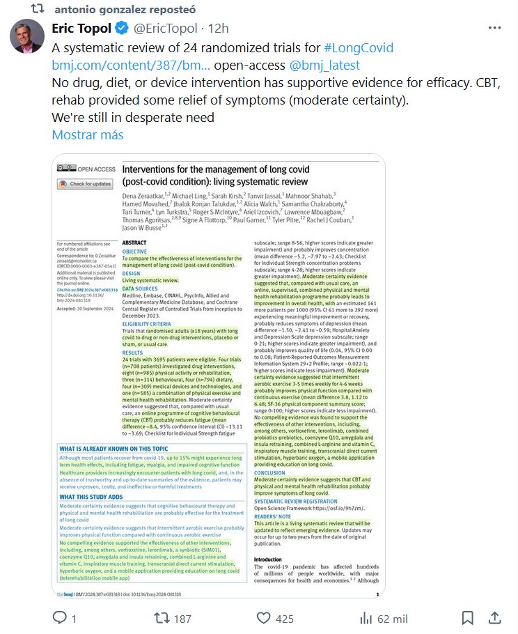 EN INGLÉS Eric Topol @EricTopol Una revisión sistemática de 24 ensayos aleatorizados para #CovidProlong Ningún fármaco, dieta o intervención con dispositivos tiene evidencia de eficacia que respalde su eficacia. La terapia cognitivo conductual y la rehabilitación proporcionaron cierto alivio de los síntomas (certeza moderada). Todavía tenemos una necesidad desesperada