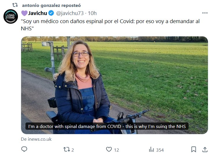 «Soy un@ médic@ con daños espinal por el Covid: por eso voy a demandar al NHS» Posted on noviembre 28, 2024 por coronado https://inews.co.uk/inews-lifestyle/im-a-doctor-with-spinal-damage-from-covid-this-is-why-im-suing-the-nhs-2873364