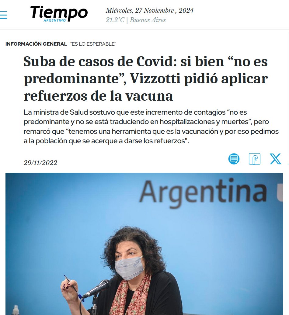 ARGENTINA Suba de casos de Covid: si bien “no es predominante”, Vizzotti pidió aplicar refuerzos de la vacuna La ministra de Salud sostuvo que este incremento de contagios “no es predominante y no se está traduciendo en hospitalizaciones y muertes”, pero remarcó que “tenemos una herramienta que es la vacunación»