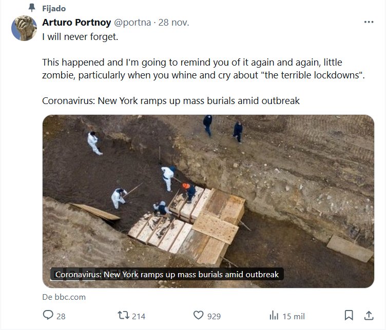 EN INGLÉS Fijado Arturo Portnoy @portna Nunca lo olvidaré. Esto pasó y te lo voy a recordar una y otra vez, pequeño zombi, sobre todo cuando te quejes y llores por «los terribles confinamientos». > Coronavirus: Nueva York aumenta los entierros masivos en medio del brote