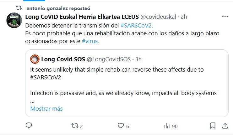OBVIO, TARDE Y YA IMPRACTICABLE Long CoVID Euskal Herria Elkartea LCEUS @covideuskal · 2h Debemos detener la transmisión del #SARSCoV2. Es poco probable que una rehabilitación acabe con los daños a largo plazo ocasionados por este #virus