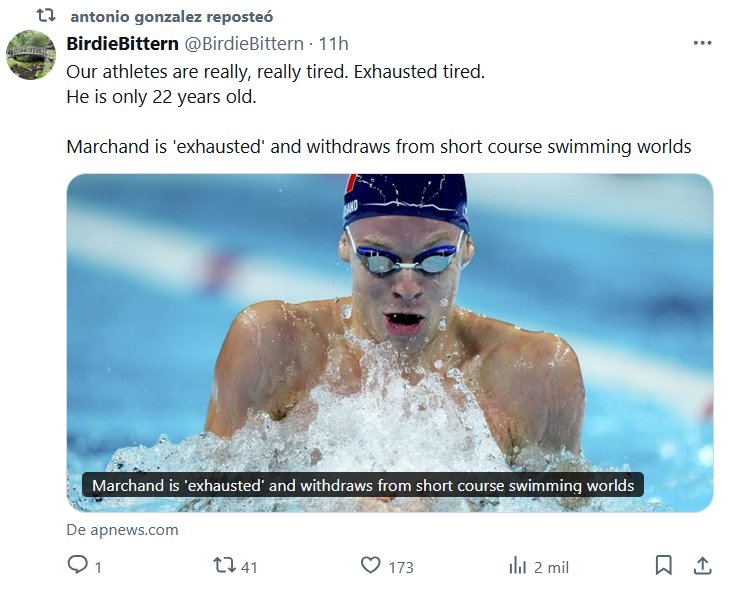 HAGAMOSCOMOQUENOHAYCOVID NO ESTARÍA RESULTANDO (EN INGLÉS) Nuestros atletas están muy, muy cansados. Agotados, agotados. Tiene sólo 22 años. Marchand está «agotado» y se retira del Mundial de natación en piscina corta