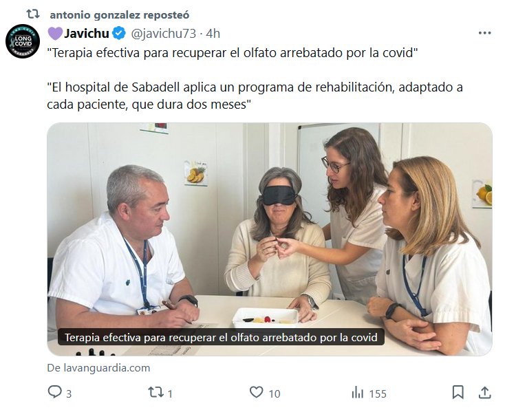 «Terapia efectiva para recuperar el olfato arrebatado por la covid» «El hospital de Sabadell aplica un programa de rehabilitación, adaptado a cada paciente, que dura dos meses» Posted on diciembre 2, 2024 por coronado https://www.lavanguardia.com/vida/20241202/10161504/terapia-efectiva-recuperar-olfato-arrebatado-covid.html