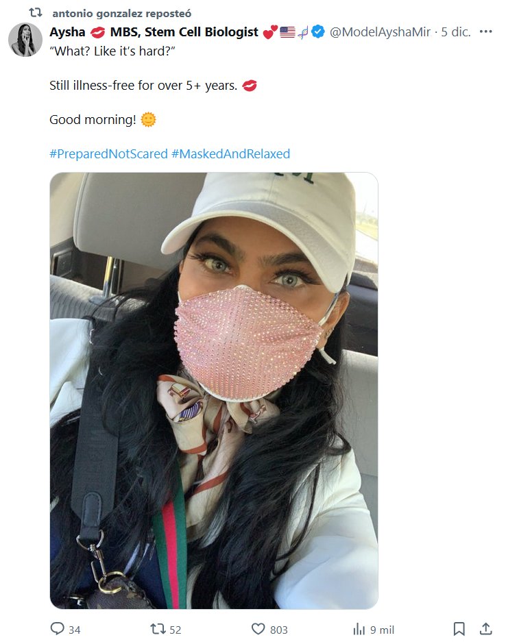 EL SECRETO DE SUS OJOS : UNA DOCTORA NOS TESTIMONIA CON LA MASCARILLA PUESTA Aysha 💋 MBS, Bióloga de células madre 💕🇺🇸🧬🥇 @ModelAyshaMirza “¿Qué? ¿Como si fuera difícil?” Sigue sin enfermarse desde hace más de 5 años. 💋 ¡Buenos días! 🌞 #PreparadaNoAsustada #EnmascaradaYRelajada