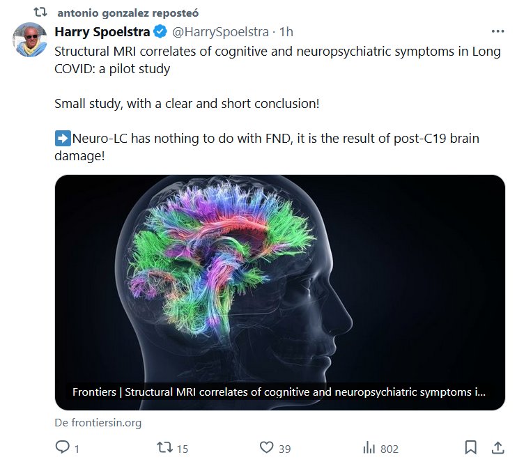 EN INGLÉS Harry Spoelstra @HarrySpoelstra La resonancia magnética estructural se correlaciona con los síntomas cognitivos y neuropsiquiátricos en la COVID prolongada: un estudio piloto ¡Estudio pequeño, con una conclusión clara y breve! ➡️La neuro-LC no tiene nada que ver con la FND, es el resultado del daño cerebral posterior al COVID-19
