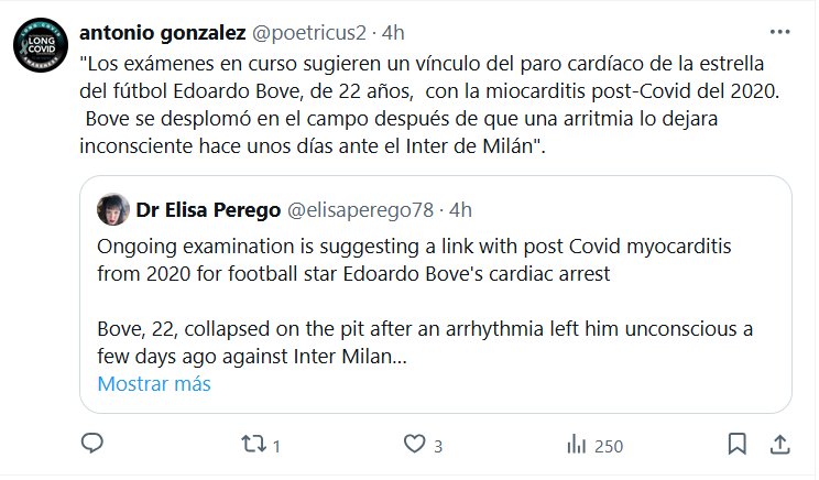 SÍ AFECTA A JÓVENES SANOS Y NO ERA LEVE, Y NO ES NI RESFRIADO NI GRIPE «Los exámenes en curso sugieren un vínculo del paro cardíaco de la estrella del fútbol Edoardo Bove, de 22 años, con la miocarditis post-Covid del 2020. Bove se desplomó en el campo después de que una arritmia lo dejara inconsciente hace unos días ante el Inter de Milán»