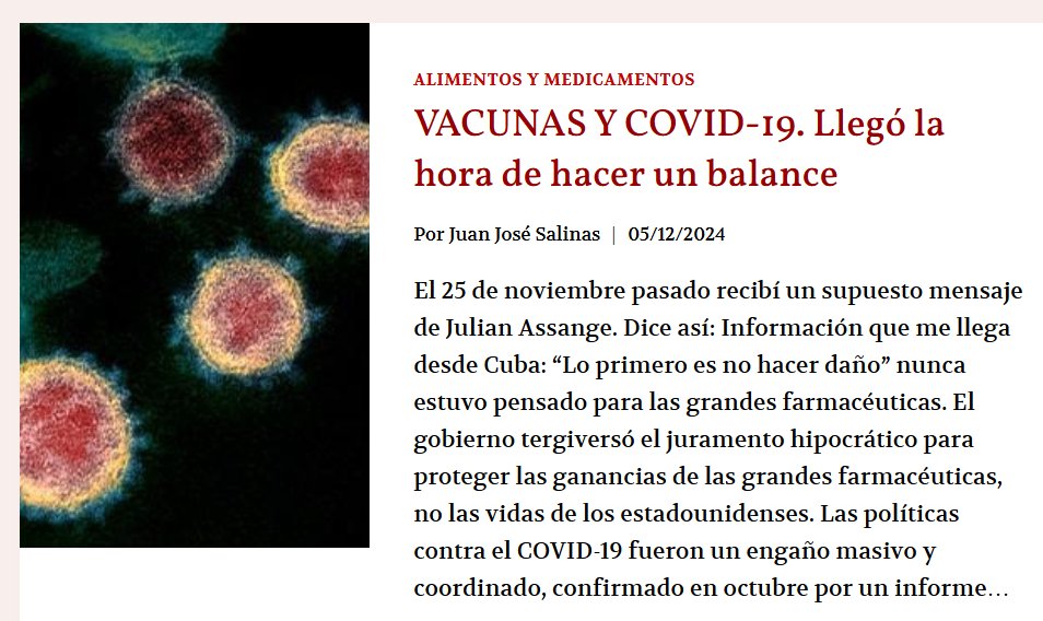 El 25 de noviembre pasado recibí un supuesto mensaje de Julian Assange. Dice así: Información que me llega desde Cuba: “Lo primero es no hacer daño” nunca estuvo pensado para las grandes farmacéuticas. El gobierno tergiversó el juramento hipocrático para proteger las ganancias de las grandes farmacéuticas, no las vidas de los estadounidenses. Las políticas contra el COVID-19 fueron un engaño masivo y coordinado, confirmado en octubre por un informe de la Cámara de Representantes
