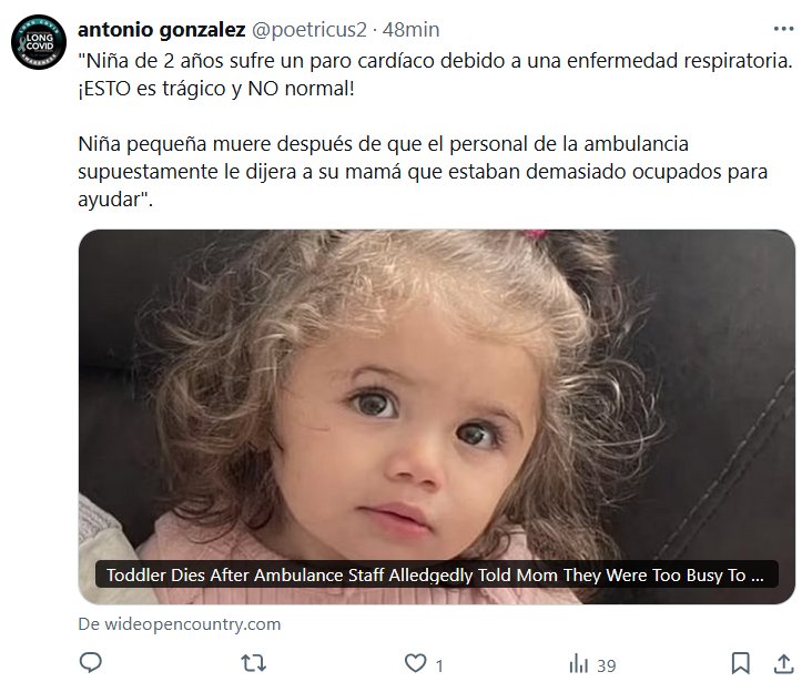 NODIGAMOSCOVID HACE ESTRAGOS «Niña de 2 años sufre un paro cardíaco debido a una enfermedad respiratoria. ¡ESTO es trágico y NO normal! Niña pequeña muere después de que el personal de la ambulancia supuestamente le dijera a su mamá que estaban demasiado ocupados para ayudar»