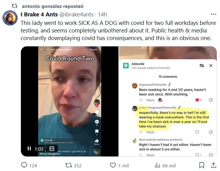 TESTIMONIOS (EN INGLÉS) Esta señora fue a trabajar ENFERMA COMO UN PERRO con covid durante dos días laborales completos antes de hacerse la prueba, y parece que no le preocupa en absoluto. La salud pública y los medios de comunicación constantemente restan importancia al covid y tiene consecuencias, y esta es obvia.