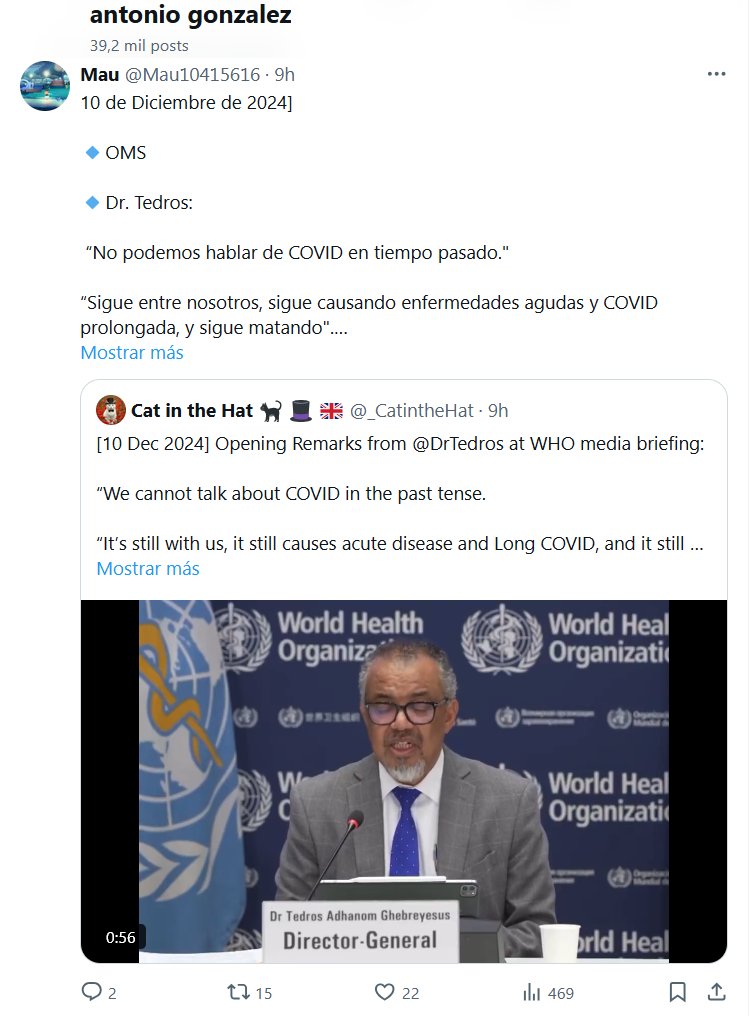 10 de Diciembre de 2024 🔹OMS 🔹Dr. Tedros: “No podemos hablar de COVID en tiempo pasado.» “Sigue entre nosotros, sigue causando enfermedades agudas y COVID prolongada, y sigue matando». “El mundo podría querer olvidarse de COVID-19, pero no podemos permitirnos hacerlo”