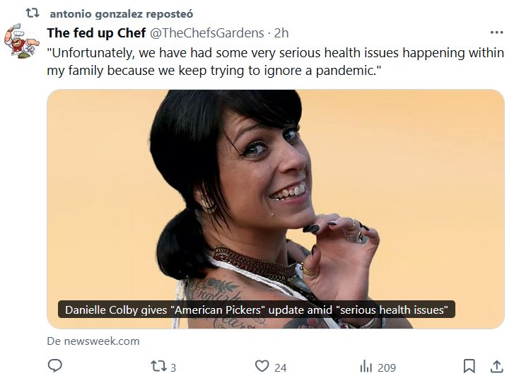 CAZADORES DE TESOROS: TESTIMONIOS Danielle Colby ofrece una actualización para ‘American Pickers’ en medio de ‘serios problemas de salud’ «Desafortunadamente, hemos tenido algunos problemas de salud muy graves dentro de mi familia porque seguimos tratando de ignorar una pandemia» FRANK FRITZ FALLECIÓ HACE POCO