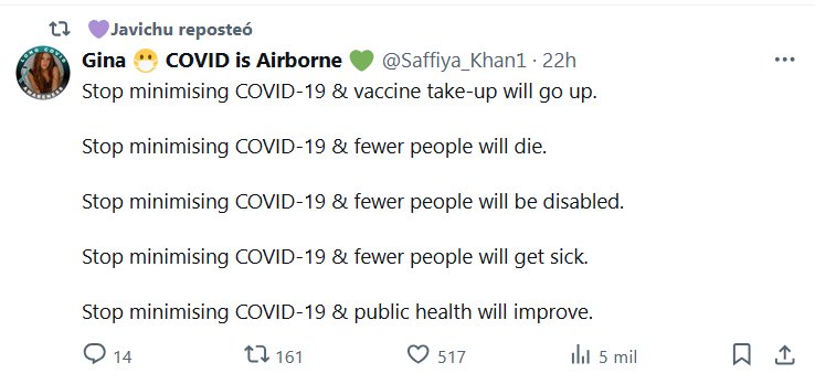 ESCUCHO VOCES (EN INGLÉS) 💜Javichu reposteó Gina 😷 El COVID se transmite por el aire 💚 @Saffiya_Khan1 Dejen de minimizar el COVID-19 y aumentará la aceptación de la vacuna. Dejen de minimizar el COVID-19 y menos personas morirán. Dejen de minimizar el COVID-19 y menos personas quedarán discapacitadas. Dejen de minimizar el COVID-19 y menos personas enfermarán. Dejen de minimizar el COVID-19 y mejorará la salud pública