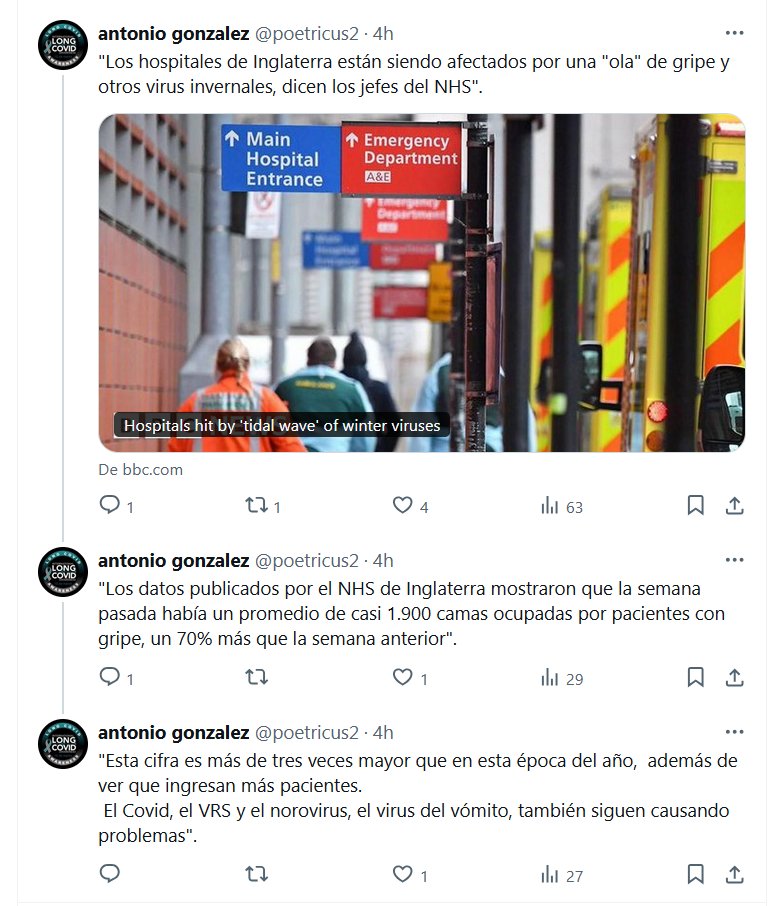 NODIGAMOSCOVID Y POSTCOVID HACEN ESTRAGOS «Los hospitales de Inglaterra están siendo afectados por una «ola» de gripe y ‘otros virus’ invernales, dicen los jefes del NHS» «Esta cifra es más de tres veces mayor que en esta época del año, además de ver que ingresan más pacientes. El Covid, el VRS y el norovirus, el virus del vómito, también siguen causando problemas».
