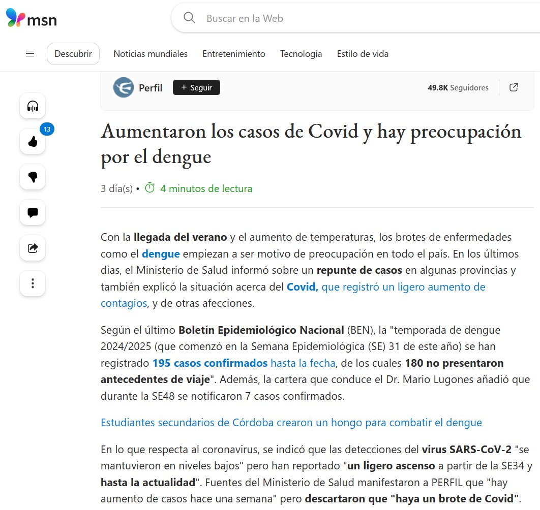 Perfil on MSN.com, 2024-12-10 Aumentaron los casos de Covid y hay preocupación por el dengue Posted on diciembre 13, 2024 por coronado https://www.msn.com/es-ar/noticias/argentina/aumentaron-los-casos-de-covid-y-hay-preocupaci%C3%B3n-por-el-dengue/ar-AA1vC1KX