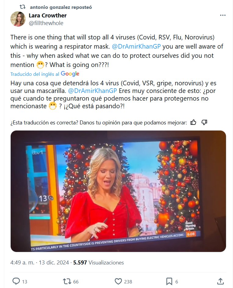 POR FIN PERIODISMO! (EN INGLÉS) Antonio González reposteó Lara Crowther @fillthewhole Hay una cosa que detendrá los 4 virus (Covid, VSR, gripe, norovirus) y es usar una mascarilla. @DrAmirKhanGP Eres muy consciente de esto: ¿por qué cuando te preguntaron qué podemos hacer para protegernos no mencionaste 😷 [MASCARILLA]? ¡¿Qué está pasando?!