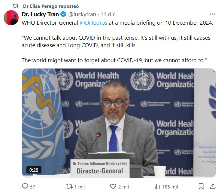 REPEAT WITH ME (EN INGLÉS) La Dra. Elisa Perego reposteó Dra. Lucky Tran @luckytran El Director General de la OMS @DrTedros en una conferencia de prensa el 10 de diciembre de 2024: «No podemos hablar de la COVID en tiempo pasado. Todavía está entre nosotros, todavía causa enfermedades agudas y COVID prolongada, y todavía mata. El mundo podría querer olvidarse de la COVID-19, pero no podemos permitirnos hacerlo»