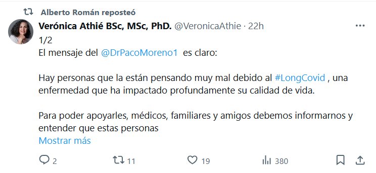 Verónica Athié BSc, MSc, PhD. @VeronicaAthie · 1/2 El mensaje del @DrPacoMoreno1 es claro: Hay personas que la están pensando muy mal debido al #LongCovid , una enfermedad que ha impactado profundamente su calidad de vida.