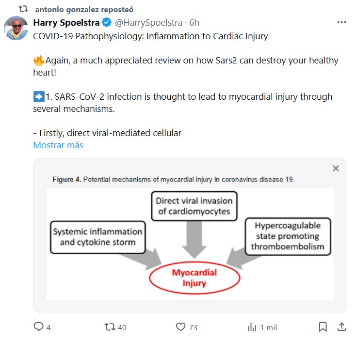 EN INGLÉS antonio gonzalez reposteó Harry Spoelstra @HarrySpoelstra Fisiopatología de la COVID-19: de la inflamación a la lesión cardíaca 🔥¡Una vez más, una revisión muy apreciada sobre cómo el SARS-CoV-2 puede destruir su corazón sano! ➡️1. Se cree que la infección por SARS-CoV-2 provoca una lesión miocárdica a través de varios mecanismos.