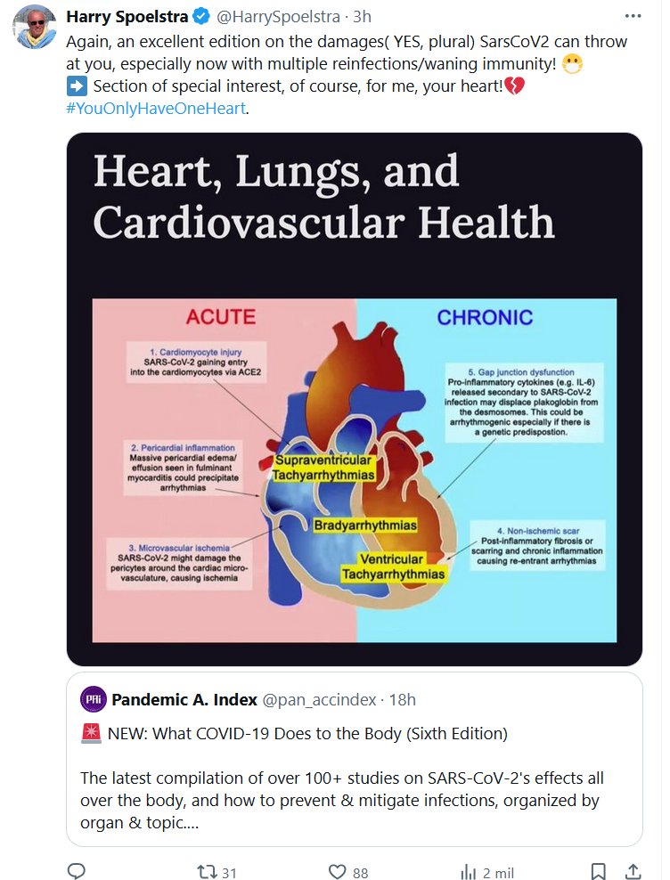 EN INGLÉS Harry Spoelstra @HarrySpoelstra Una vez más, una excelente edición sobre los daños (SÍ, en plural) que puede causarte el SarsCoV2, ¡especialmente ahora con múltiples reinfecciones/inmunidad menguante! 😷 ➡️ Sección de especial interés, por supuesto, para mí, ¡tu corazón! 💔