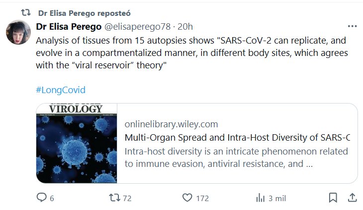 IMPORTANTE (EN INGLÉS) Dra. Elisa Perego @elisaperego78 El análisis de tejidos de 15 autopsias muestra que «el SARS-CoV-2 puede replicarse y evolucionar de manera compartimentada en diferentes partes del cuerpo, lo que concuerda con la teoría del «reservorio viral»