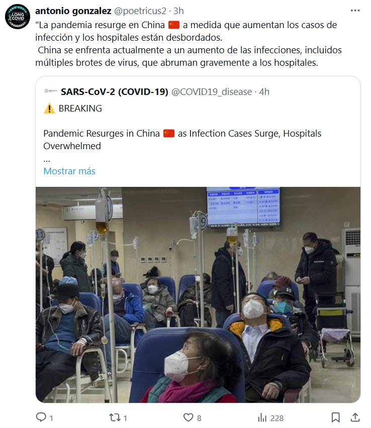 SARS‑CoV‑2 (COVID-19) @COVID19_disease ⚠️ BREAKING (EN INGLÉS) «La pandemia resurge en China 🇨🇳 a medida que aumentan los casos de infección y los hospitales están desbordados. China se enfrenta actualmente a un aumento de las infecciones, incluidos múltiples brotes de virus, que abruman gravemente a los hospitales»